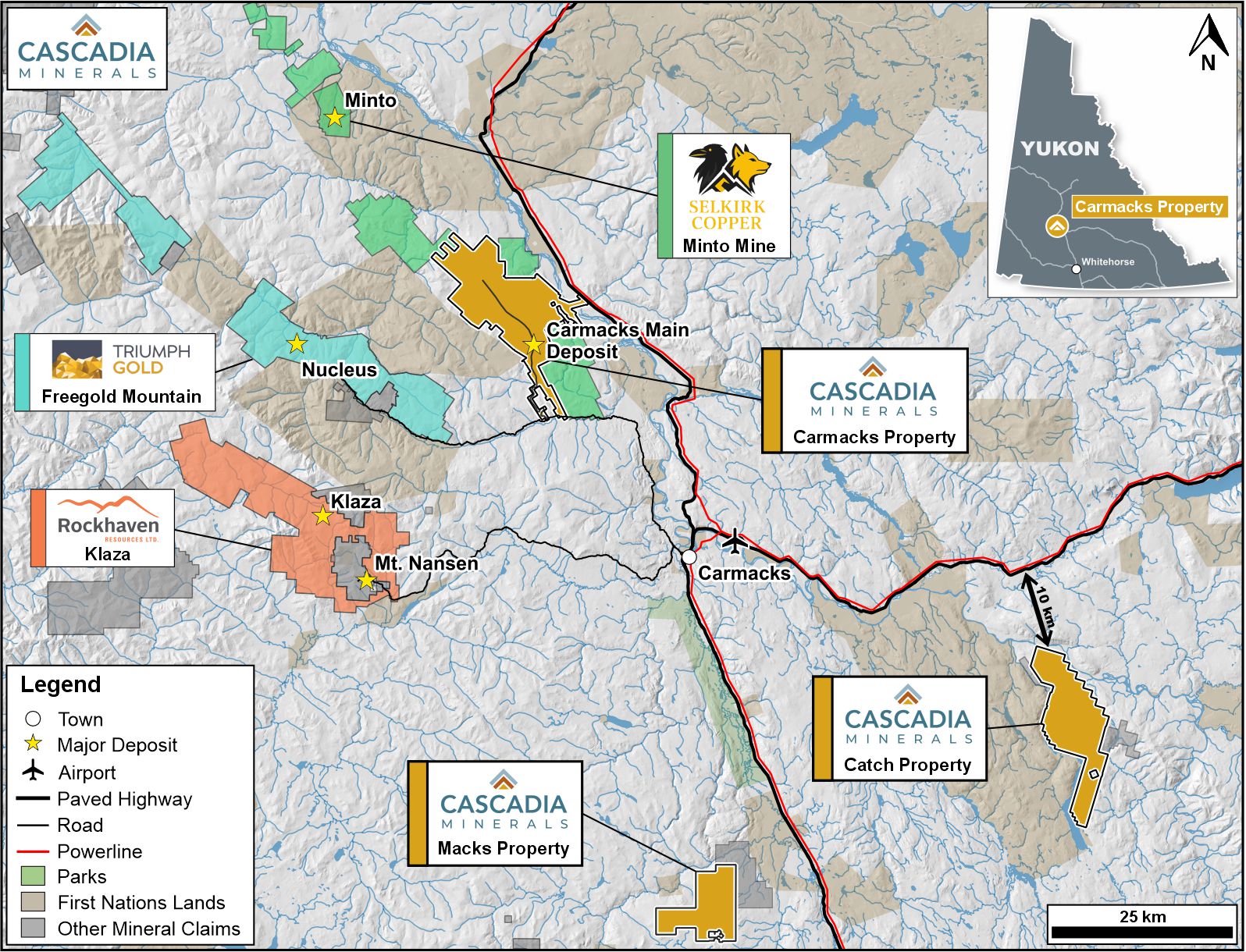 The 180 km2 Carmacks Project is located within the Traditional Territory of the Little Salmon Carmacks and Selkirk First Nations, approximately 40 km southeast of the past producing Minto Mine, which was recently acquired by Selkirk Copper Mines Inc. The Carmacks Project is road-accessible, via a 13 km access road which extends from the government-maintained Freegold Road northwest of the town of Carmacks in central Yukon. The project has an existing 40-person camp, numerous roads throughout the property, and is 10 km from grid power.